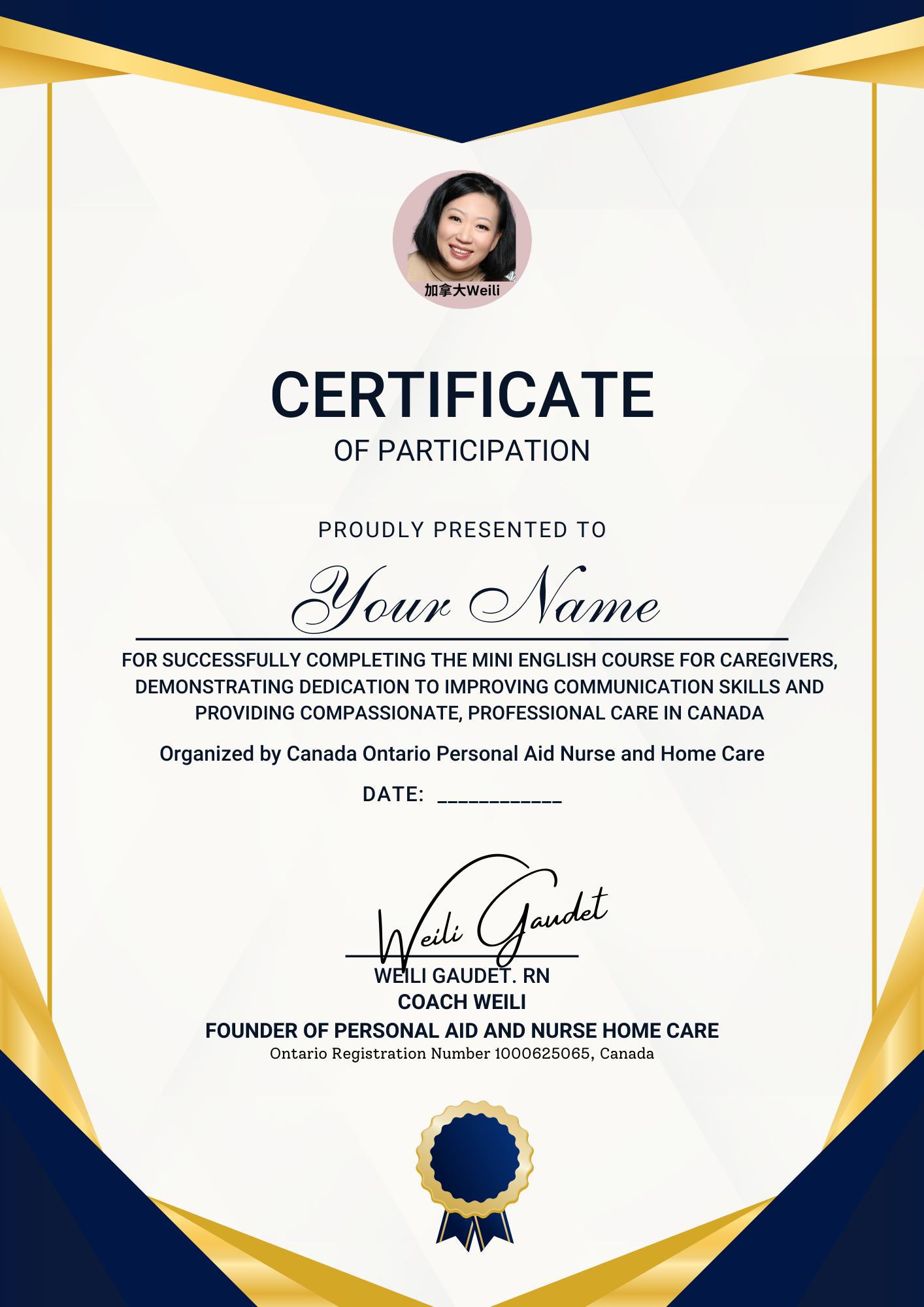 完成后,有发放加拿大安省注册护理公司的证书(见图)